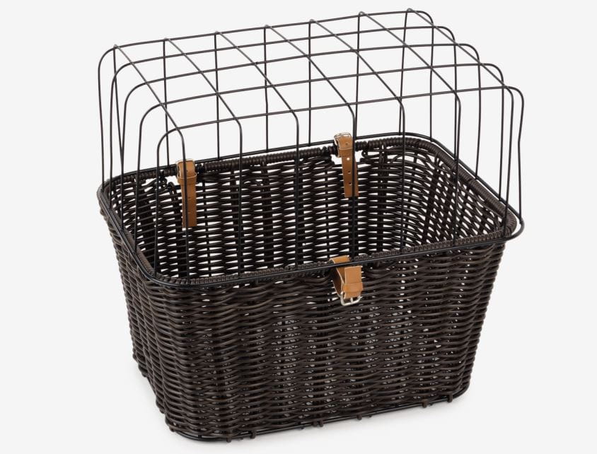 Duży kosz do przewozu zwierząt montowany na bagażniku. Z metalową kratką zabezpieczającą przewożone zwierzę.
