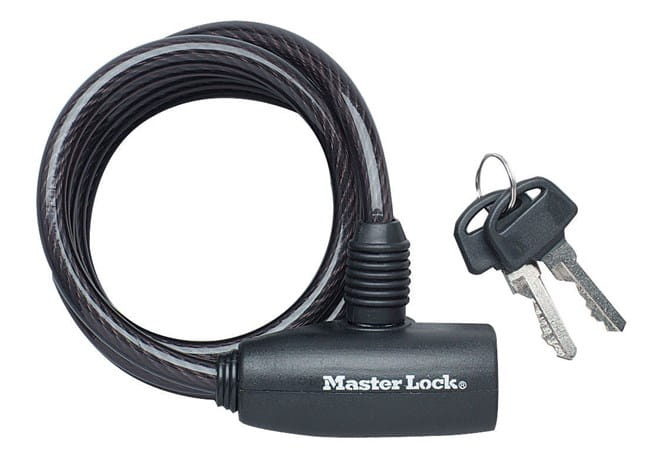 Samozwijająca się, pleciona linka ze stali. Wbudowany mechanizm blokujący za pomocą klucza zapewnia ochronę przed niepożądanym otwarciem zamka. Użycie hartowanej stali zapewnia wytrzymałość i elastyczność. Specjalna powłoka wykonana z winylu zapobiega zarysowaniom oraz jest odporna na złą pogodę. 5-pinowy cylinder ze zintegrowanym zamknięciem na klucz zapewnia dodatkową ochronę przed niepożądanym otworzeniem zamka.